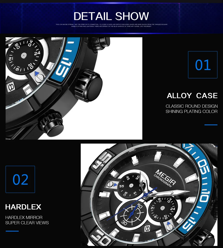 The MEGIR Men's Watch combines style and functionality, ideal for men seeking a versatile accessory. With a sporty design and features such as a chronograph and water resistance, it's perfect for everyday wear and outdoor activities.
