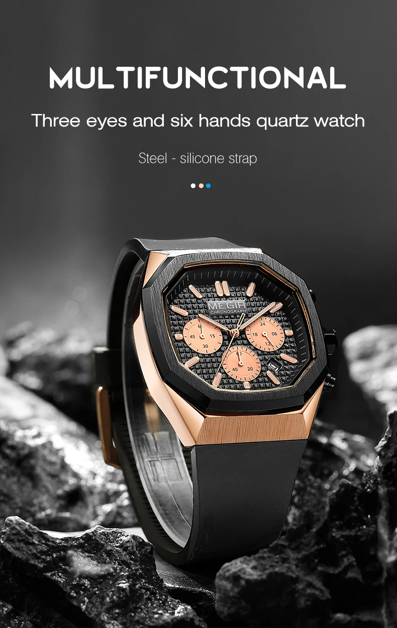 O relógio MEGIR combina estilo e funcionalidade, ideal para homens que procuram um acessório opcional para o dia a dia e atividades desportivas. Com um design robusto e características práticas, é perfeito para qualquer ocasião.
